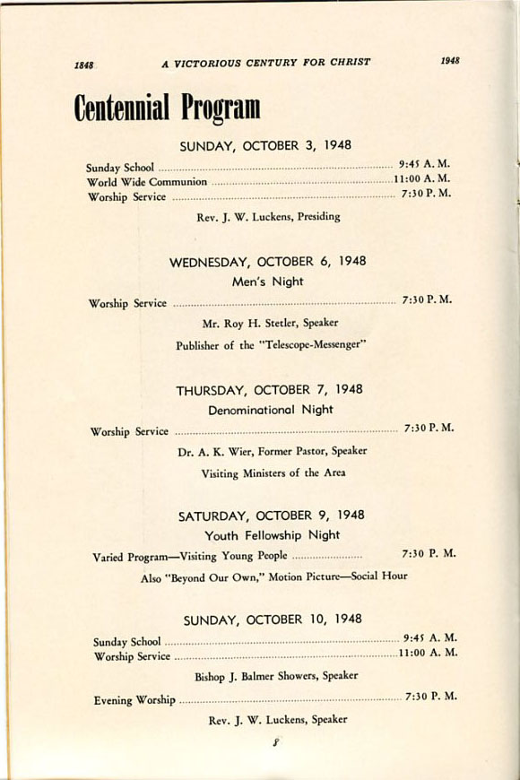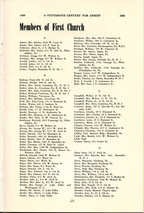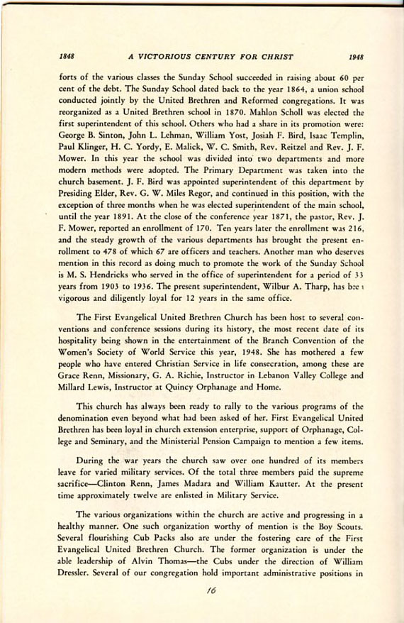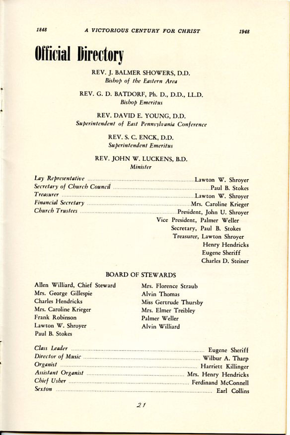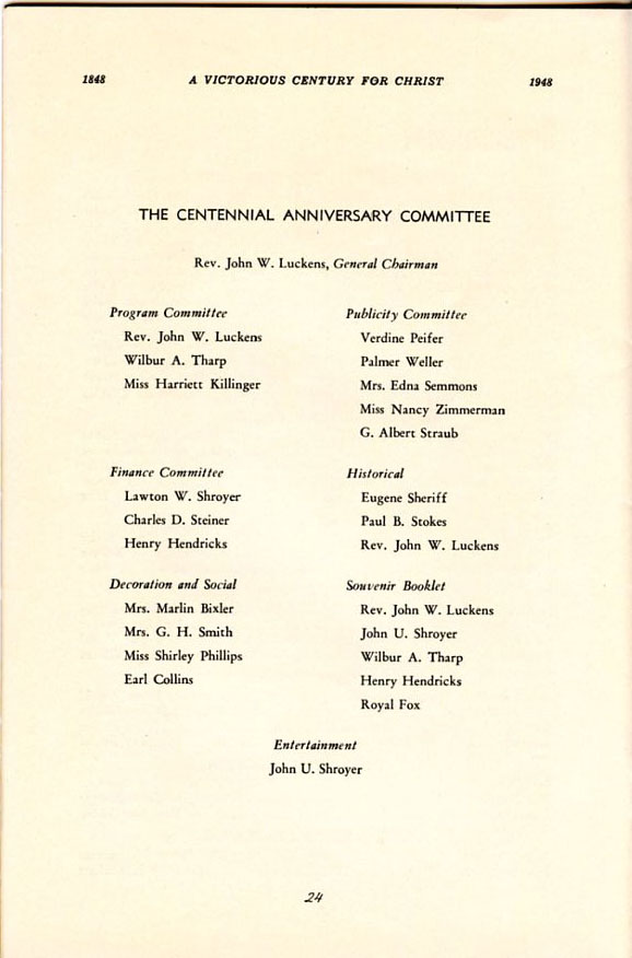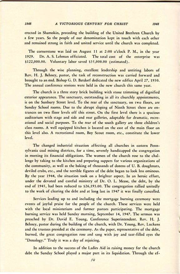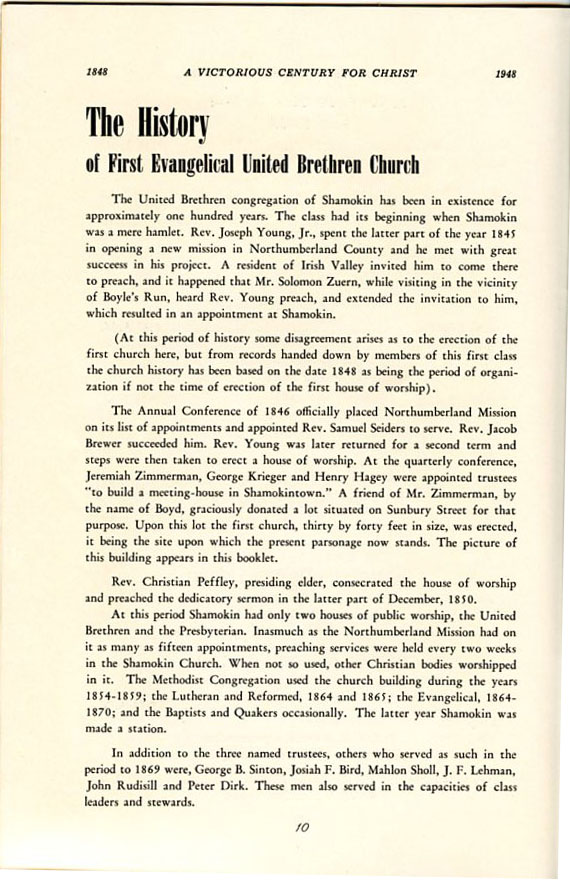 Pamphlet from the 100th Anniversary of the First Evangelical United Brethren Church, Shamokin Pennsylvania in 1948. -